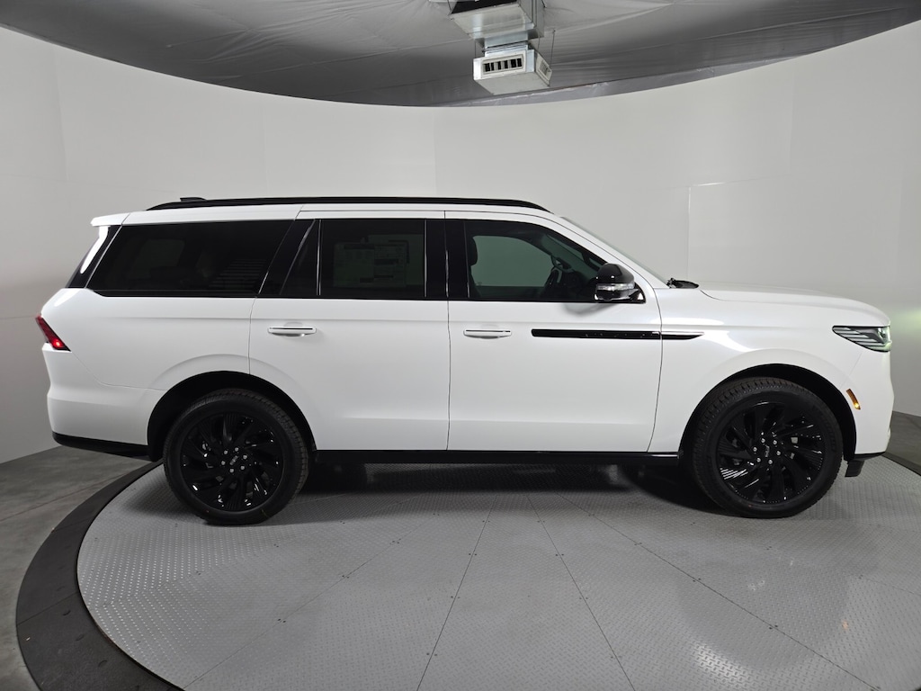 This Lincoln Navigator is equipped with the following features: Equipment Group 202A Reserve II (Auto Heated/Ventilated Premium Leather Captain's Chairs, BlueCruise Equipped (4-Years Included), Lincoln App, Lincoln Digital Experience, Radio: Revel Ultima 3D Audio System, SiriusXM with 360L (3 Months Trial), and Wheels: 22" Dark Tarnished Aluminum), Jet Appearance Package (Black Accent Badge, Black Accent Interior Pack, Black Beltline Molding, Black Painted Roof Rails, Front Bumper Fascia, Lincoln Lit Star, Unique Lincoln Grille Pillar Black Surround, and Wheels: 22" High-Gloss Ebony Aluminum), Lincoln Connectivity Package (4-Years Included), Lincoln Security Package, 4WD, Medium Light Space Gray Leather, 28 Speakers, 2nd Row Heated 40/20/40 Split Bench Seat, 3rd row seats: split-bench, 4-Wheel Disc Brakes, ABS brakes, Adaptive suspension, Air Conditioning, Alloy wheels, AM/FM radio: SiriusXM with 360L, Apple CarPlay/Android Auto, Audio memory, Auto High-beam Headlights, Auto Start-Stop Technology, Auto tilt-away steering wheel, Auto-dimming door mirrors, Auto-dimming Rear-View mirror, Auto-leveling suspension, Automatic temperature control, Brake assist, Bumpers: body-color, Compass, Delay-off headlights, Driver door bin, Driver vanity mirror, Driver's Seat Mounted Armrest, Dual front impact airbags, Dual front side impact airbags, Electronic Stability Control, Emergency communication system: 911 Assist, Exterior Parking Camera Rear, Four wheel independent suspension, Front anti-roll bar, Front Bucket Seats, Front dual zone A/C, Front License Plate Bracket, Front reading lights, Fully automatic headlights, Garage door transmitter, Heated door mirrors, Heated front seats, Heated rear seats, Heated steering wheel, HVAC memory, Illuminated entry, Leather steering wheel, Low tire pressure warning, Memory seat, Navigation system: Connected Navigation (1-year trial), Occupant sensing airbag, Outside temperature display, Overhead airbag, Overhead console, Panic alarm, Passenger door bin, Passenger seat mounted armrest, Passenger vanity mirror, Power adjustable rear head restraints, Power door mirrors, Power driver seat, Power moonroof: Panoramic Vista Roof, Power passenger seat, Power steering, Power windows, Radio data system, Rain sensing wipers, Rear air conditioning, Rear anti-roll bar, Rear audio controls, Rear reading lights, Rear window defroster, Rear window wiper, Reclining 3rd row seat, Remote keyless entry, Security system, Speed control, Speed-sensing steering, Speed-Sensitive Wipers, Split folding rear seat, Spoiler, Steering wheel memory, Steering wheel mounted audio controls, Tachometer, Telescoping steering wheel, Tilt steering wheel, Traction control, Trip computer, Turn signal indicator mirrors, Variably intermittent wipers, and Ventilated front seats.