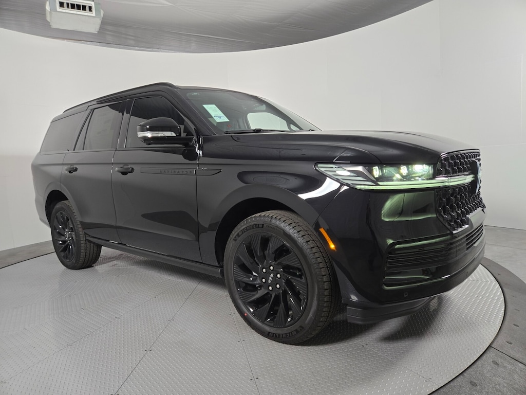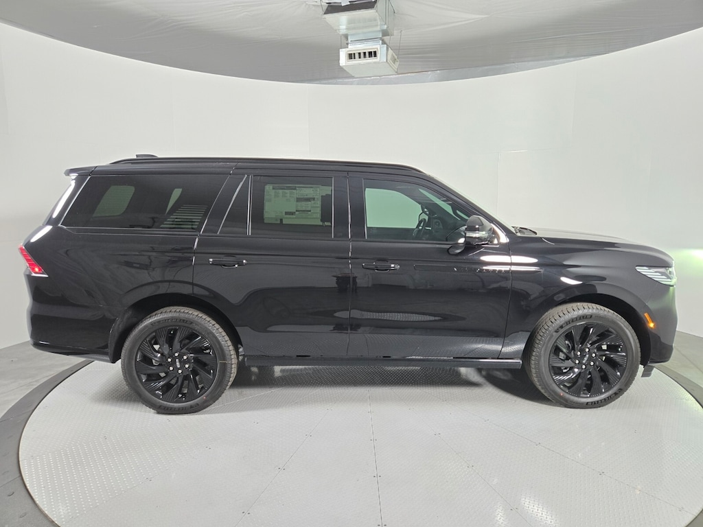 This Lincoln Navigator is equipped with the following features: Equipment Group 202A Reserve II (Auto Heated/Ventilated Premium Leather Captain's Chairs, BlueCruise Equipped (4-Years Included), Lincoln App, Lincoln Digital Experience, Radio: Revel Ultima 3D Audio System, SiriusXM with 360L (3 Months Trial), and Wheels: 22" Dark Tarnished Aluminum), Jet Appearance Package (Black Accent Badge, Black Accent Interior Pack, Black Beltline Molding, Black Painted Roof Rails, Front Bumper Fascia, Lincoln Lit Star, Unique Lincoln Grille Pillar Black Surround, and Wheels: 22" High-Gloss Ebony Aluminum), Lincoln Connectivity Package (4-Years Included), Lincoln Security Package, 4WD, Black Onyx Leather, 28 Speakers, 3rd row seats: split-bench, 4-Wheel Disc Brakes, ABS brakes, Adaptive suspension, Air Conditioning, Alloy wheels, AM/FM radio: SiriusXM with 360L, Apple CarPlay/Android Auto, Audio memory, Auto High-beam Headlights, Auto Start-Stop Technology, Auto tilt-away steering wheel, Auto-dimming door mirrors, Auto-dimming Rear-View mirror, Auto-leveling suspension, Automatic temperature control, Brake assist, Bumpers: body-color, Compass, Delay-off headlights, Driver door bin, Driver vanity mirror, Driver's Seat Mounted Armrest, Dual front impact airbags, Dual front side impact airbags, Electronic Stability Control, Emergency communication system: 911 Assist, Exterior Parking Camera Rear, Four wheel independent suspension, Front anti-roll bar, Front Bucket Seats, Front dual zone A/C, Front License Plate Bracket, Front reading lights, Fully automatic headlights, Garage door transmitter, Heated door mirrors, Heated front seats, Heated rear seats, Heated steering wheel, HVAC memory, Illuminated entry, Leather steering wheel, Low tire pressure warning, Memory seat, Navigation system: Connected Navigation (1-year trial), Occupant sensing airbag, Outside temperature display, Overhead airbag, Overhead console, Panic alarm, Passenger door bin, Passenger seat mounted armrest, Passenger vanity mirror, Power adjustable rear head restraints, Power door mirrors, Power driver seat, Power moonroof: Panoramic Vista Roof, Power passenger seat, Power steering, Power windows, Radio data system, Rain sensing wipers, Rear air conditioning, Rear anti-roll bar, Rear audio controls, Rear reading lights, Rear window defroster, Rear window wiper, Reclining 3rd row seat, Remote keyless entry, Security system, Speed control, Speed-sensing steering, Speed-Sensitive Wipers, Split folding rear seat, Spoiler, Steering wheel memory, Steering wheel mounted audio controls, Tachometer, Telescoping steering wheel, Tilt steering wheel, Traction control, Trip computer, Turn signal indicator mirrors, Variably intermittent wipers, and Ventilated front seats.